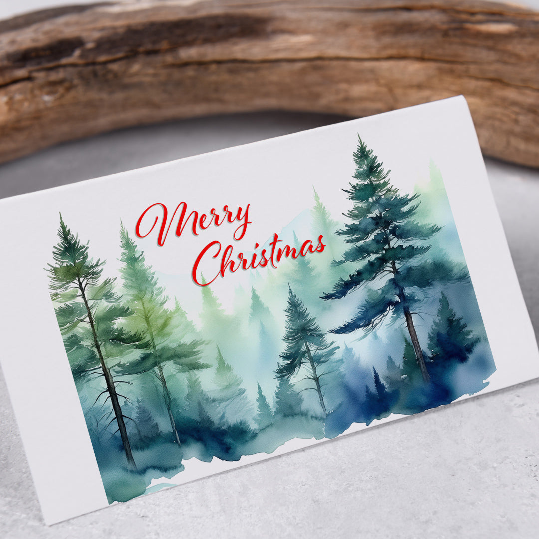 You’ll complete a small, polished watercolour composition featuring a luscious evergreen forest, much like the one pictured here — perfect for reproducing as personalized Christmas cards, festive prints, or seasonal gifts.